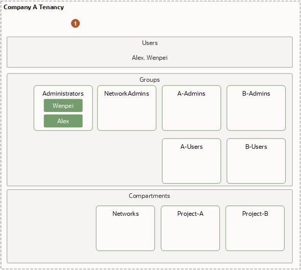 La société Acme s'inscrit à Oracle Cloud Infrastructure et indique à Oracle qu'une employée nommée Wenpei sera l'administrateur par défaut. En réponse, Oracle :