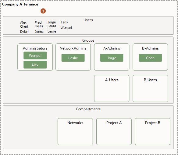 A ce stade, Alex appartient au groupe Administrators et peut désormais créer des utilisateurs. Il provisionne les utilisateurs nommés Leslie, Jorge et Cheri, et les place respectivement dans les groupes NetworkAdmins, A-Admins et B-Admins. Alex crée également d'autres utilisateurs qui seront ensuite placés dans les groupes A-Users et B-Users par les administrateurs du projet A et du projet B.