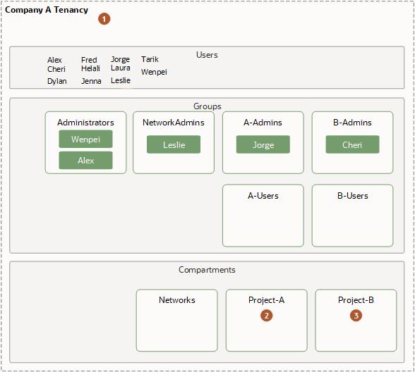 Les utilisateurs des groupes A-Users et B-Users peuvent désormais utiliser les instances et les volumes attachés existants dans les compartiments Project-A et Project-B, respectivement. Voici comment se présente la disposition :