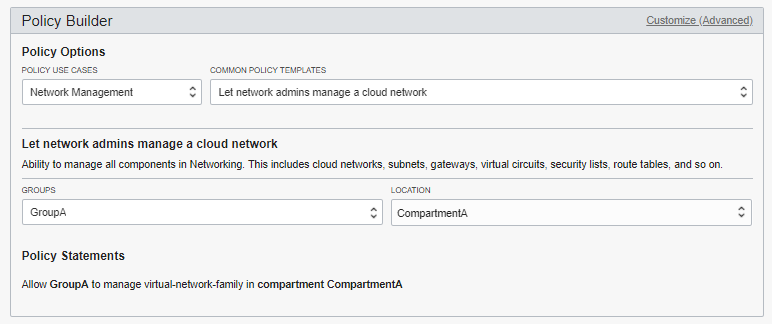 Allow group GroupA to manage virtual-network-family in compartment CompartmentA Allow group GroupA to use instance-family in compartment CompartmentA