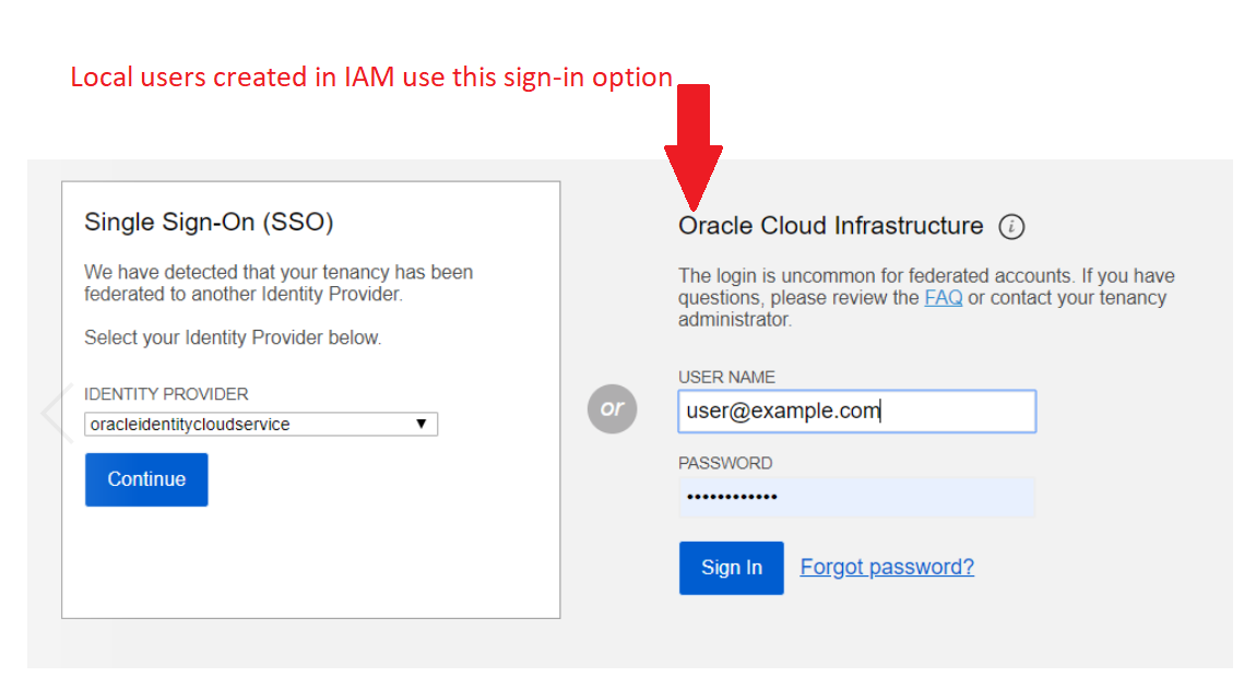 Les utilisateurs créés au cours de cette procédure sont créés dans IAM et sont parfois appelés "utilisateurs locaux". Si votre location est fédérée avec un autre fournisseur d'identités (comme Oracle Identity Cloud Service, Azure AD ou Okta), la page de connexion à la console affiche deux options de connexion. Les utilisateurs locaux que vous créez dans IAM utilisent l'option Oracle Cloud Infrastructure pour se connecter, comme indiqué dans l'image suivante :