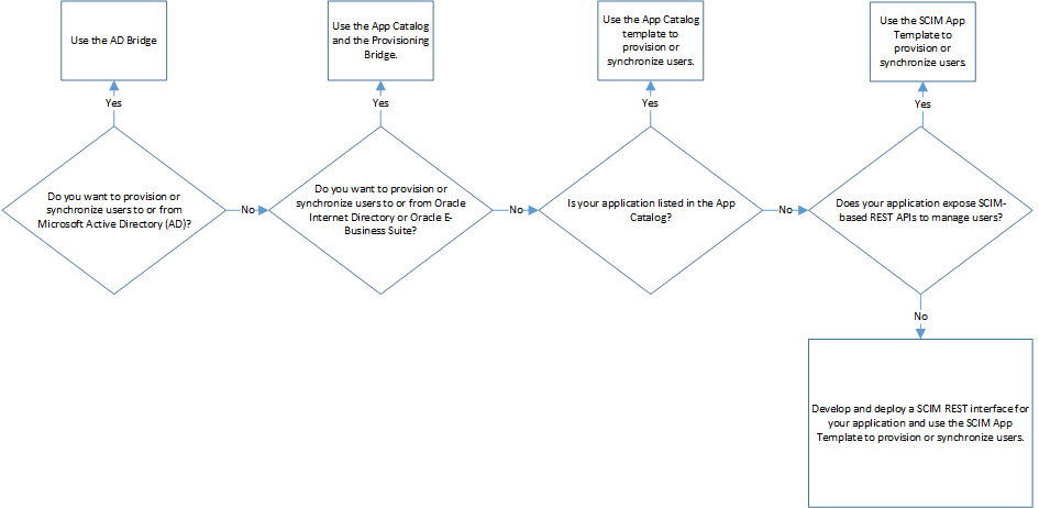 Dans cet organigramme, vous pouvez découvrir la méthode à utiliser pour intégrer votre application à Oracle Identity Cloud Service. Voulez-vous synchroniser les utilisateurs vers ou à partir de Microsoft Active Directory (AD) ? Si la réponse est oui, utilisez le pont AD. Si la réponse est non, voulez-vous synchroniser les utilisateurs à partir d'un annuaire LDAP tel qu'Oracle Internet Directory ? Si la réponse est oui, utilisez le catalogue d'applications et le pont de provisionnement. Si la réponse est non, votre application est-elle répertoriée dans le catalogue d'applications ? Si la réponse est oui, utilisez le modèle de catalogue d'applications pour provisionner ou synchroniser les utilisateurs. Si la réponse est non, votre application expose-t-elle des API REST basées sur SCIM pour gérer les utilisateurs ? Si la réponse est oui, utilisez l'un des modèles SCIM génériques pour provisionner ou synchroniser les utilisateurs. Si la réponse est non, développez et déployez une interface REST SCIM pour votre application, et utilisez le modèle d'application SCIM pour provisionner ou synchroniser les utilisateurs.