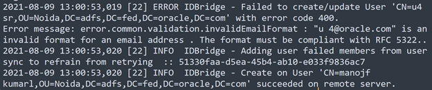 Les échecs peuvent être suivis via les journaux de pont AD. Vous pouvez trouver les fichiers journaux à partir de l'interface utilisateur du client de pont AD. Recherchez le nom utilisateur ou le nom de groupe pour connaître les échecs survenus lors de la synchronisation.